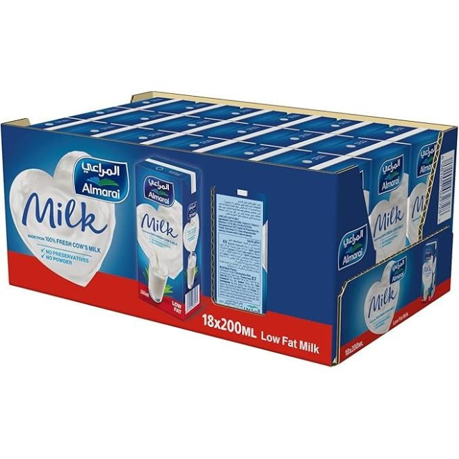 Almarai Low Fat Plain Milk in convenient 200ml boxes delivers essential nutrients including protein, vitamins, minerals, and healthy fats. Created from recombined UHT-treated cow milk powder, it ensures purity and long shelf life. This milk offers complete nutritional value and a smooth taste, making it ideal for enhancing your tea, coffee, or culinary recipes while supporting your physical well-being. Packaged in an 18-pack carton, it’s a practical choice for daily consumption with expert-approved quality.