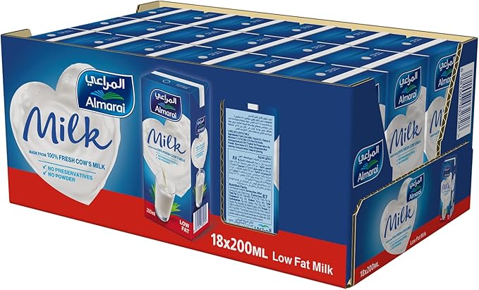 Almarai Plain Milk Low Fat, 200ml x 18, offers a balanced blend of essential nutrients, including protein, vitamins, and minerals, with a low fat content. Produced from recombined UHT-treated cow milk powder, it ensures safety and freshness with a smooth taste. Ideal for enhancing your tea, coffee, or favorite recipes, this milk supports physical well-being while delivering the complete goodness of dairy in a convenient pack.