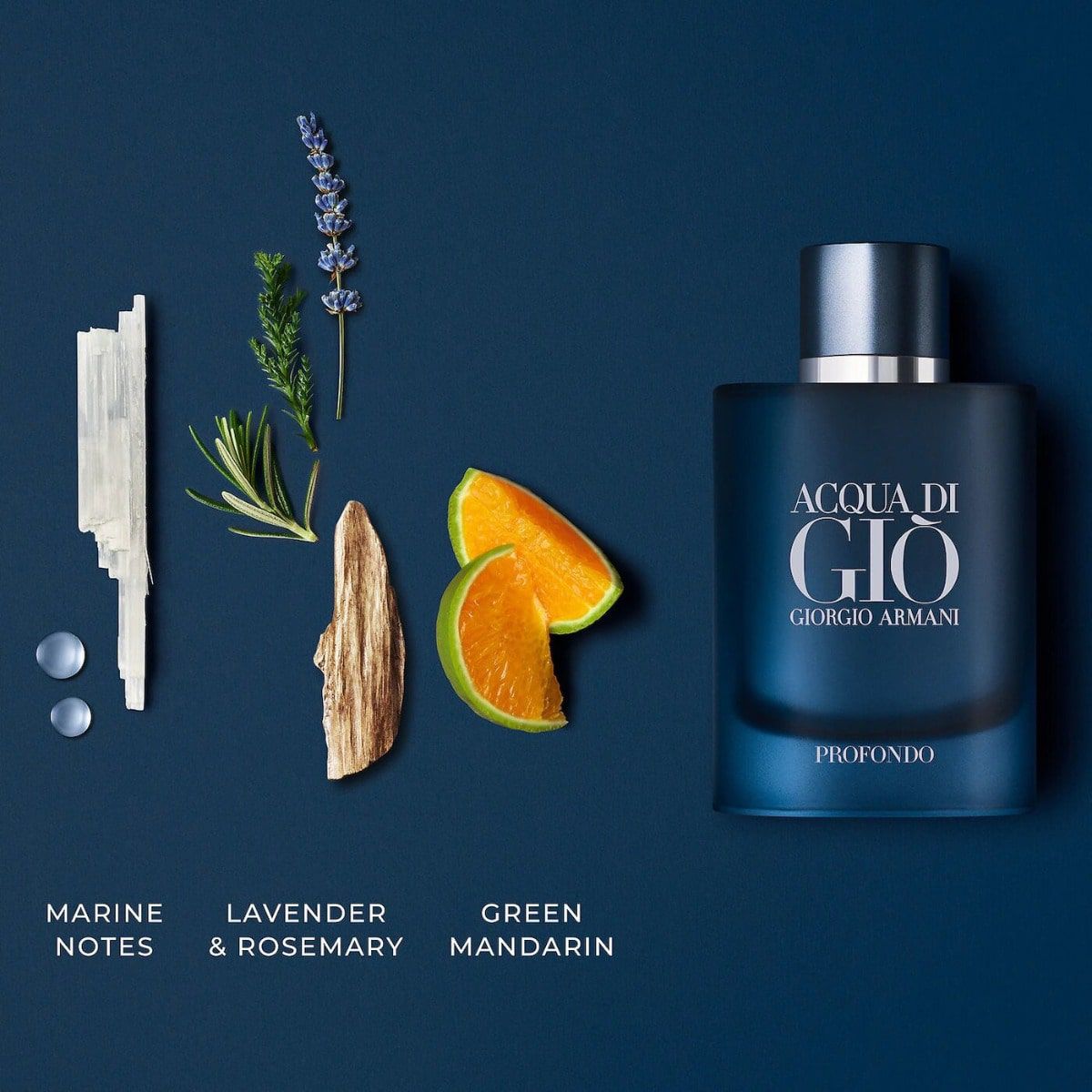 Acqua di Gio Profondo by Giorgio Armani is an Sweet Fougere scent for men. A serene take on the classic Acqua Di Gio, this Eau de Parfum opens with salty marine notes before melting into amping cypress, lavender, and rosemary to produce a submarine fern. Patchouli and musk notes form the woody base, leaving a lasting, mysterious trail.