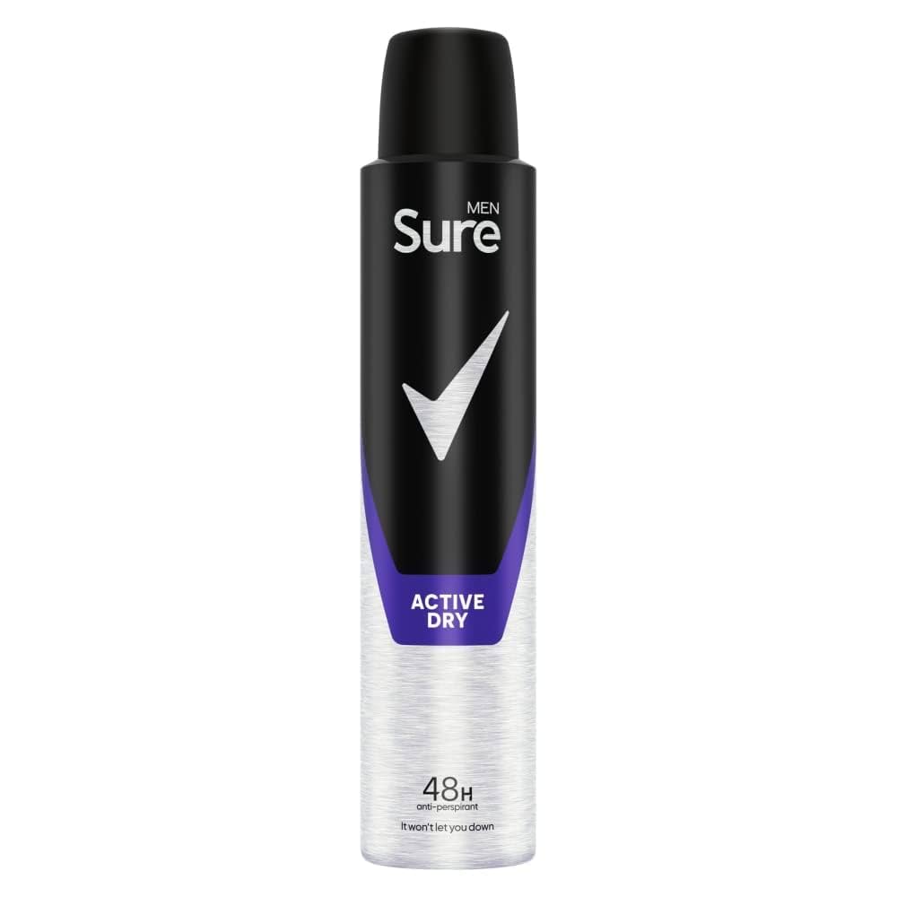 Get all-day freshness and 48-hour protection and confidence from morning to night with Sure Men Active Dry Anti-Perspirant Deodorant Aerosol and keep sweat and odour at bay. When you work hard, Sure work harder. Sure, it won’t let you down. How to use: Firstly, shake the Sure Active Dry Anti-Perspirant Deodorant can. Then hold it 15 centimetres away from your underarm and spray evenly in a well-ventilated area. Do not use on broken skin. Stop use if rash or irritation occurs. Avoid direct inhalation. Do not spray near eyes. Use only as directed. *ethyl alcohol.