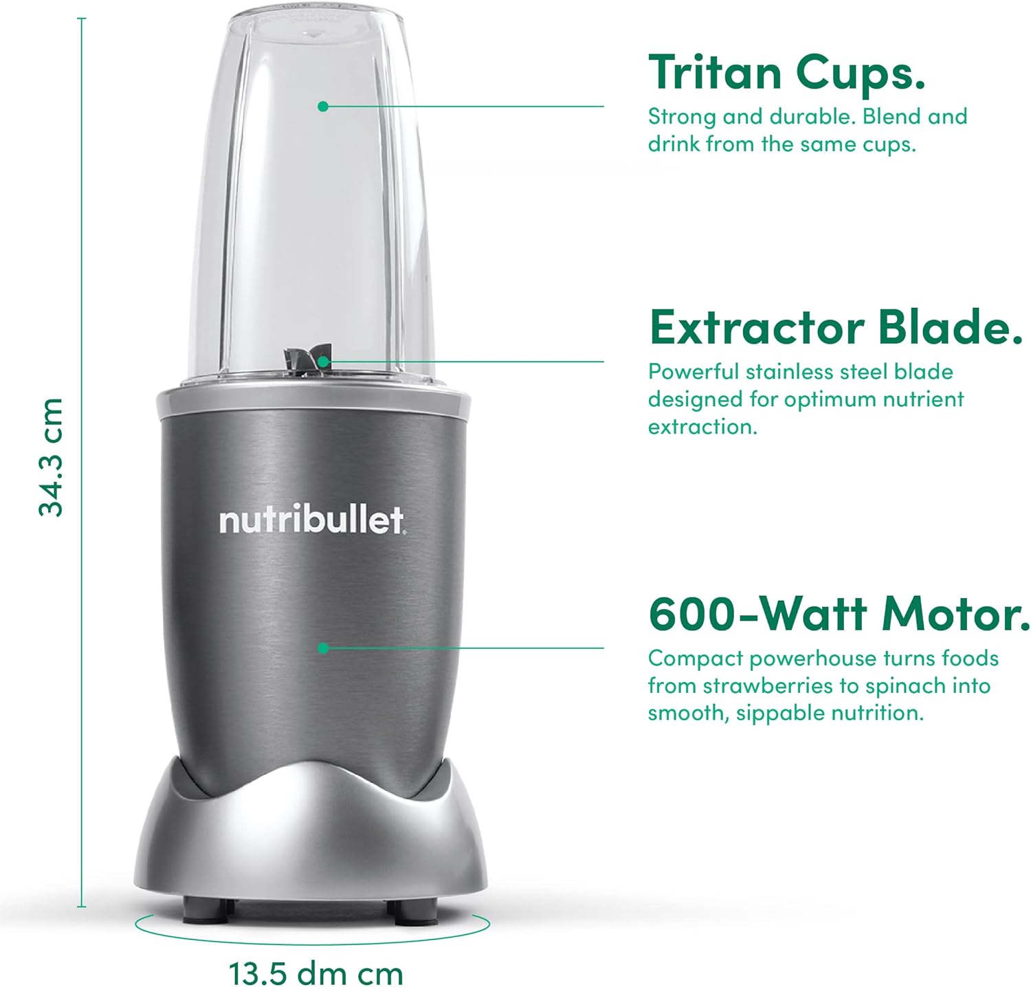 NutriBullet 600 Watts, 9pc Accessories,, Multi-Function High Speed Blender, Mixer System With Nutrient Extractor, Smoothie Maker, Grey, NBR-1212M, 1-year limited warranty