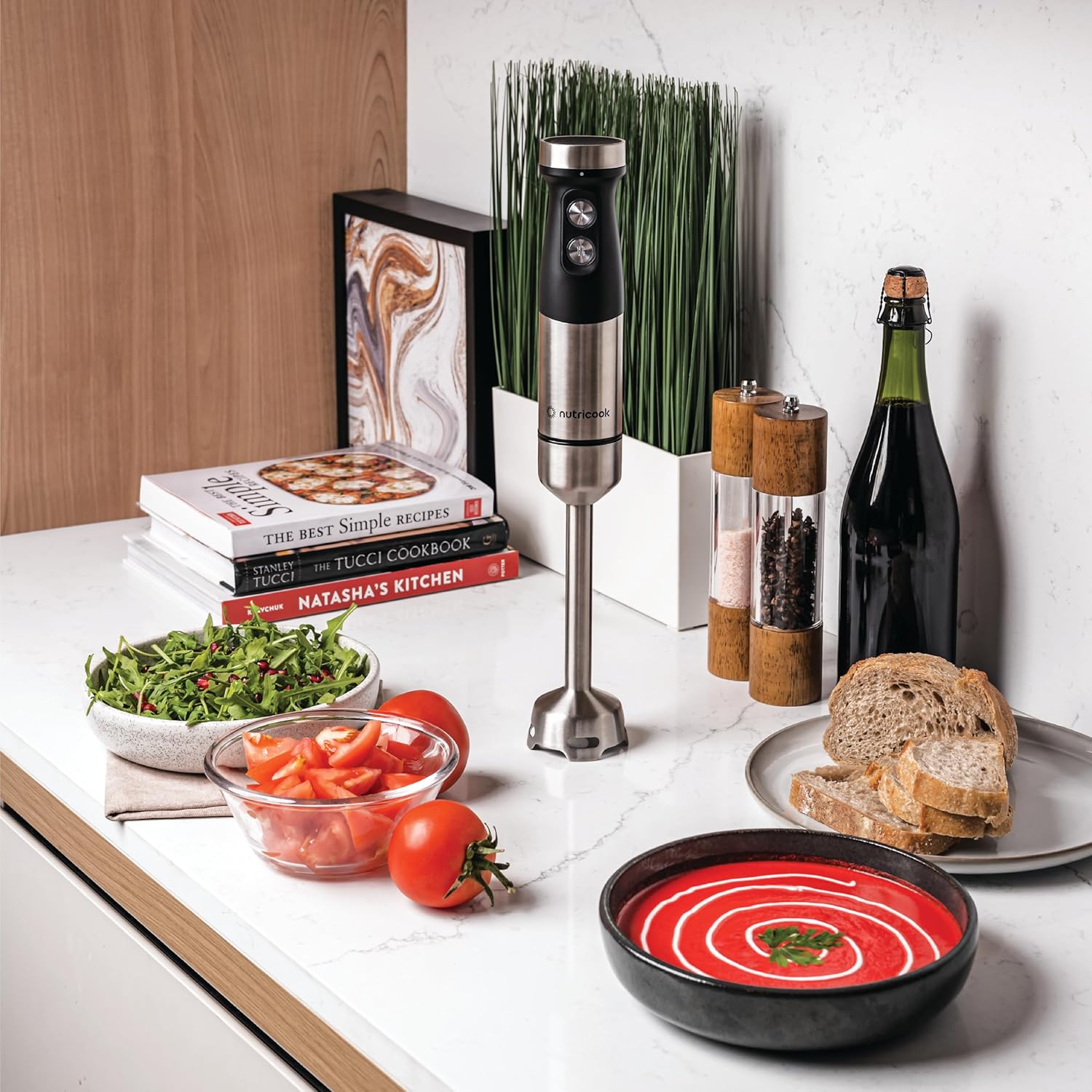 Nutricook 1200W DC motor Hand Blender With 700ml beaker, 500ml Chopping Bowl, Stainless Steel Blades, Wisk with 20 variable speed 4in1 Blend, chop, whisk, froth, HB100ME, 2 yrs warranty