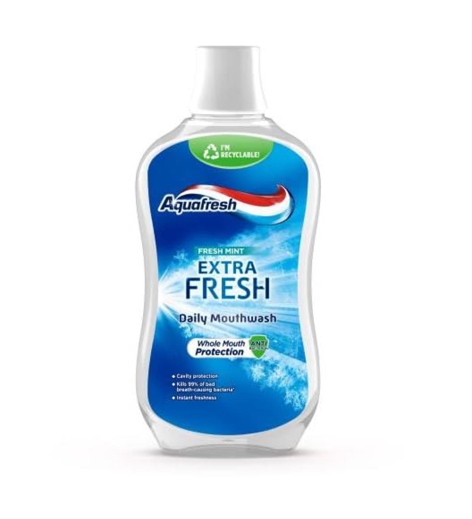 Aquafresh Mouthwash - Fresh Mint - Extra Fresh Daily - Active Refreshing Breath. Strengthens the enamel. Non-alcoholic. Aquafresh Extra Fresh Daily Mouthwash is an antibacterial formulation that helps to combat plaque on the teeth for a clean and healthy mouth. Contains an active mineral that binds and strengthens the enamel. Help reduce the buildup of Plaque to maintain healthy teeth and gums.